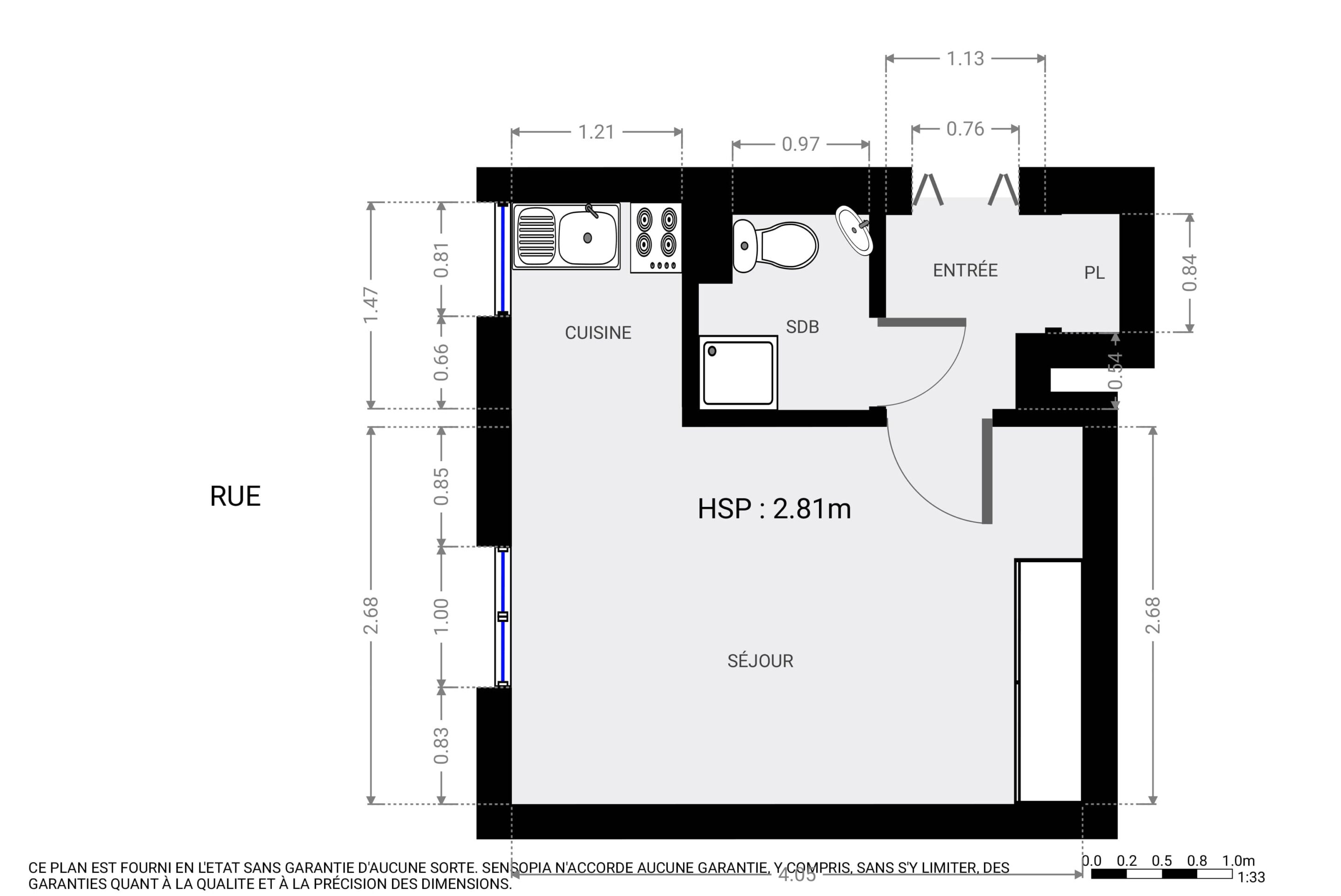 Il comprend une entrée, une salle d’eau + wc, une pièce principale et un coin cuisine.